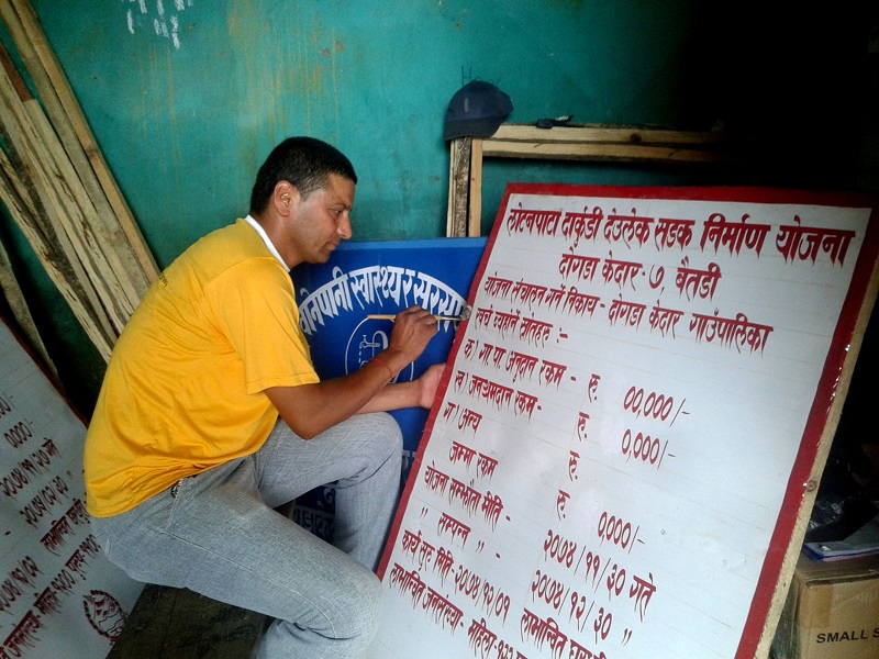 द्वन्द्वकालमा भूमिगत भएर क्रान्तिमा होमिएका बैतडी दोगडाकेदार गाउँपालिका ३ श्रीकोटका जनक बहादुर चन्दलाई अक्षर लेख्ने र कुची, रङ्ग र ब्रससँग खेल्ने काम नै रमाइलो लाग्छ । तत्कालीन माओवादी पार्टीभित्र पनि चित्रकलाकै काम गरेका ३६ वर्षीय युवक जनकले हिजोआज अक्षर लेखेर मासिक ३० हजार रुपैयाँ कमाउँछन् । उनी मुख्यतया साइनबोर्ड, ब्यानर र होर्डिङ बोर्ड लेख्ने काम गर्छन् । दोगडाकेदार गाउँपालिकामा हुने कार्यक्रमहरुका लागि तुल, ब्यानर बनाउने र विभिन्न संघ संस्थाका नारासहितका होर्डिङ बोर्ड लेख्ने उनको दिनचर्या हो ।