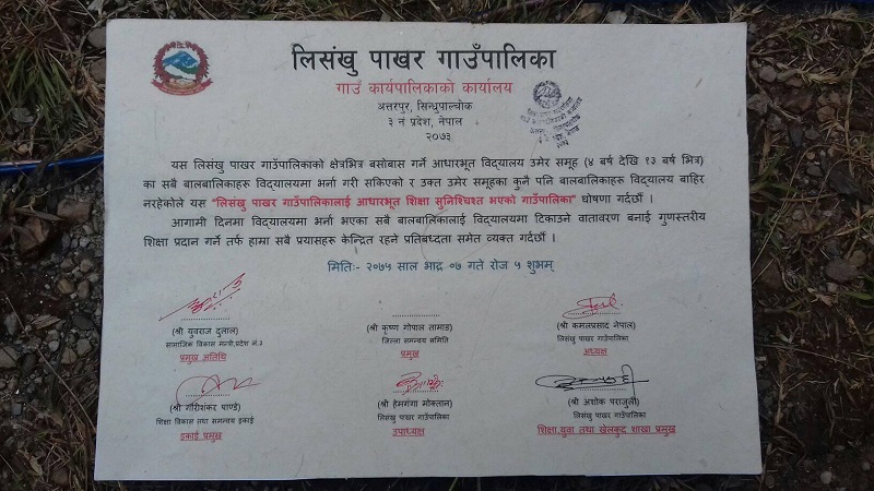सिन्धुपाल्चोक जिल्लाको लिसंखु-पाखर गाउँपालिकालाई आधारभुत शिक्षा सुनिश्चित पालिका घोषणा गरिएको छ । पालिकाको कार्यालय अत्तरपुरमा एक कार्यक्रमको आयोजना गरी गाउँपालिकालाई आधारभुत शिक्षा सुनिश्चित घोषणा गरिएको उपप्रमूख हेमगंगा मोक्तानले जानकारी दिइन् ।