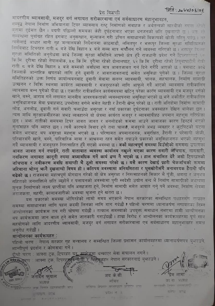 वाग्मती टिपर ब्यवसायी संघ, स्वरोजगार ट्रक, पिटर ब्यवसायी संघ र अखिल नेपाल यातायात मजदुर संघ, ३ नम्बर प्रदेशले संयुक्त विज्ञप्ति निकालेर आन्दोलनको घोषणा गरेका हुन् । उनीहरुले दिउँसो टिपर चलाउन पाउनुपर्ने र प्रहरीको अभद्र ब्यवहार सुधार गर्नु पर्ने मूख्य माग राखेका छन् ।