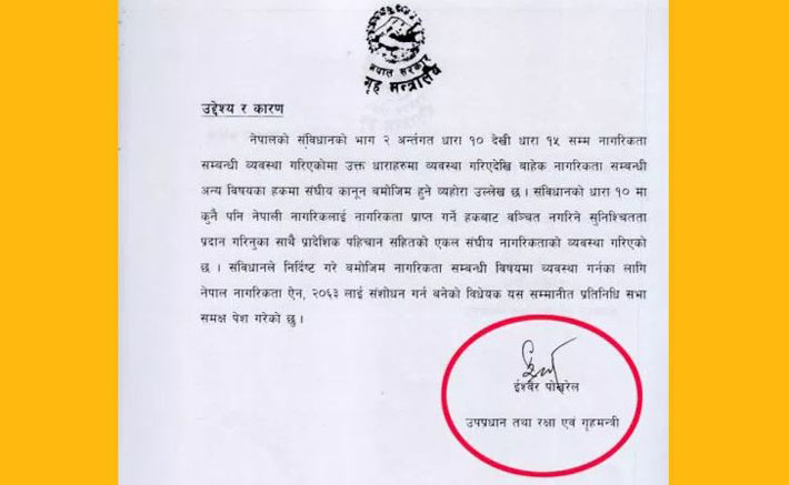 संघीय संसद सचिवालयमा दर्ता भएर संसदमा छलफल भई राज्य व्यवस्था समितिमा आएको विधेयकमा गृहमन्त्री रामबहादुर थापाले हस्ताक्षर गर्नुपर्नेमा उपप्रधानमन्त्री तथा रक्षामन्त्री ईश्वर पोखरेलले हस्ताक्षर गरेका छन् ।