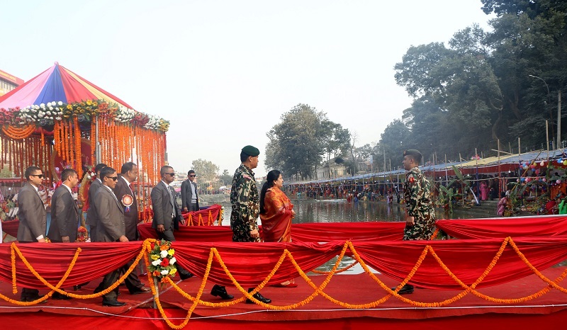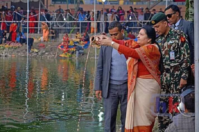 कात्तिक २७ काठमाडौँ : राष्ट्रपति विद्यादेवी भण्डारीले कमलपोखरीमा छठको पूजा गरेकी छन् । काठमाडौँको कमलपोखरीमा बनाइएको घाटमा पुगेर राष्ट्रपति भण्डारीले अस्ताउँदो सूर्यलाई अर्घ जल चढाएर पूजा गरेकी हुन् ।