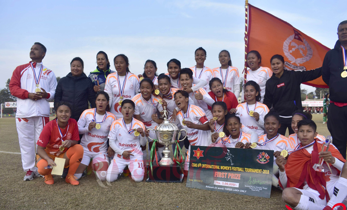 काठमाडौँ, १२ मङ्सिर: सशत्र प्रहरीको एपिएफ क्लबले प्रधान सेनापति छैठाँै अन्तर्राष्ट्रिय आमन्त्रण महिला फुटबल प्रतियोगिताको उपाधि जितेको छ । भद्रकालीस्थित सैनिक मुख्यालयको खेल मैदानमा आज भएको फाइनल खेलमा त्रिभुवन आर्मी क्लबलाई पेनाल्टी सुट आउटमा ४–२ गोलले पराजित गर्दै एपिएफ च्याम्पियन बनेको हो । योसँगै सशस्त्र लगातार चौथो पटक उपाधि जित्न सफल भएको हो । एपिएफले तेस्रो, चौथो, पाँचौ र छैटौँ संस्कारमा उपाधि जितेको थियो ।