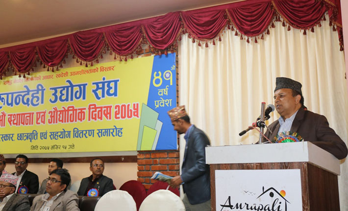 उद्योग, पर्यटन, वन तथा वातावरणमन्त्री लीला गिरीले उद्योगको स्थापना विस्तृत अध्ययन र दीर्घकालीन प्रभाव मूल्याङ्कन विनाअनुमति दिएका कारण हाल सञ्चालनमा रहेका उद्योग स्थानान्तरणको समस्या झेल्न बाध्य भएको बताउनुभयो । विस्तृत अध्ययन र दीर्घकालीन प्रभाव मूल्याङ्कन गरेर मात्रै त्यस्तो अनुमति दिनुपर्नेमा जोड दिदैं उहाँले करको दायरामा आएर सरकारलाई सहयोग गर्न उद्योगीलाई आग्रह गर्नुभयो । नेपाल उद्योग परिसङ्घका प्रदेश नं ५ संयोजक एजाज आलमले उद्योगी व्यवसायी फाइल बोकेर अहिले पनि सङ्घीय राजधानी धाउनुपरेको बताउँदै यसप्रति प्रदेश सरकारको ध्यानाकर्षण गराउनुभयो । सङ्घका अध्यक्ष गणेशप्रसाद अधिकारीको अध्यक्षतामा कार्यक्रम सम्पन्न भयो ।