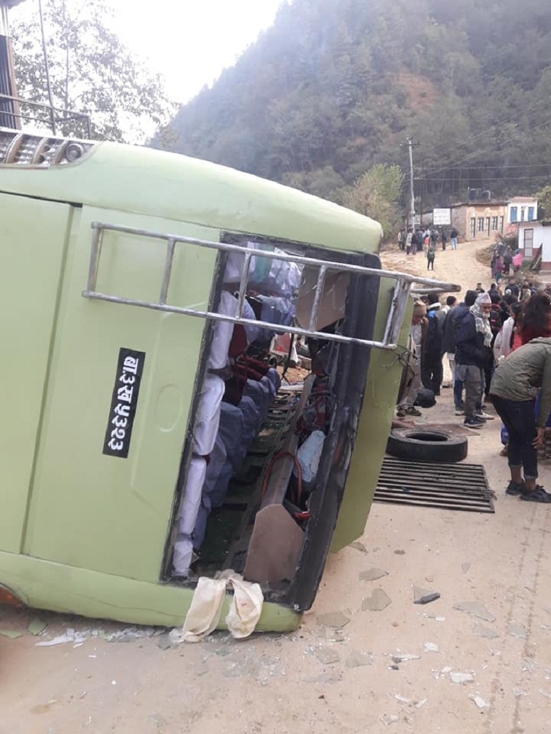 मंसिर २०, काभ्रे । विहीबार बिहान ८ बजे काभ्रे जिल्लाको बेथानचोक गाउँपालिका वडा नंं.–४ स्थित ढुंखर्कबाट खोपासीतर्फ आउँदै गरेको बा ३ ख ५३२३ नम्बरको बस ढुंखर्क–खोपासीको भित्री सडक खण्डमा पल्टिएको छ । जिल्ला प्रहरी कार्यालय काभ्रेका अनुसार बसले ५५ जना विवाहका जन्ती बोकेर हिंडेको थियो । बसमा यात्रा गरिरहेका जन्तीहरुमध्ये ९ जना घाइते भएका छन् ।