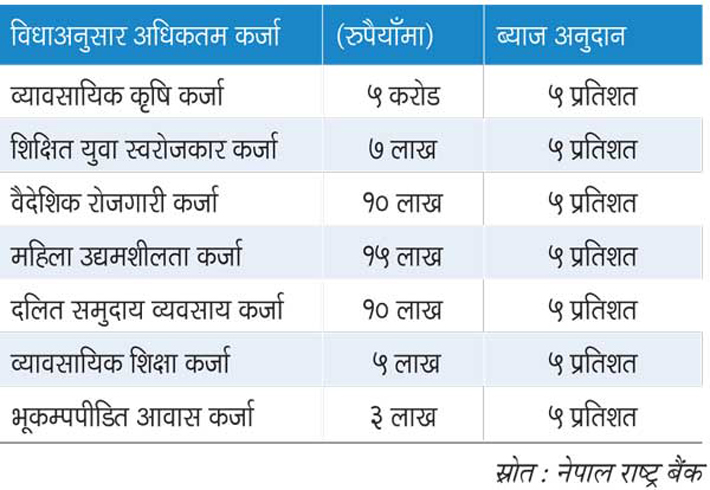 राष्ट्रिय वाणिज्य बैंकको आधार दर ६.३३ प्रतिशत छ । बैंकहरूले यस्ता उत्पादनशील कर्जामा आधार ब्याजदरमा दुई प्रतिशत बिन्दुले थपेर ब्याजदर तय गर्छन् । सरकारले पाँच प्रतिशत बिन्दुले ब्याजदर अनुदान दिने भएकाले राष्ट्रिय वाणिज्य बैंकबाट ३.३३ प्रतिशतमा तोकिएका शीर्षकमा सहुलियत कर्जा प्राप्त गर्न सकिने बैंकका प्रमुख कार्यकारी अधिकृत (सीईओ) किरणकुमार श्रेष्ठले बताए ।