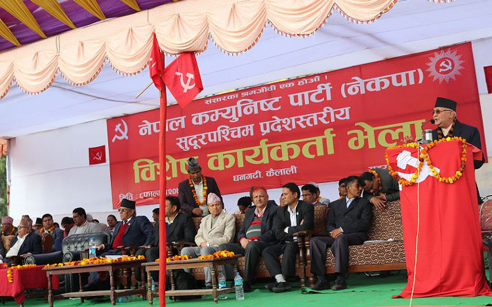 धनगढी, ८ फागुन : प्रधानमन्त्री एवं नेपाल कम्युनिष्ट पार्टी (नेकपा)का अध्यक्ष केपी शर्मा ओलीले दुई कम्युनिष्ट पार्टीको एकता टुक्रिने र फुट्ने कुरा प्रतिक्रियावादीको हल्ला मात्र भएको बताउनुभएको छ । नेकपाद्वारा आज यहाँ आयोजित सुदूरपश्चिमस्तरीय विशेष कार्यकर्ता भेलालाई सम्बोधन गर्दै प्रधानमन्त्री ओलीले कम्युनिष्ट आन्दोलन कसैले भनेर फुट्नेवाला छैन भन्नुभयो ।