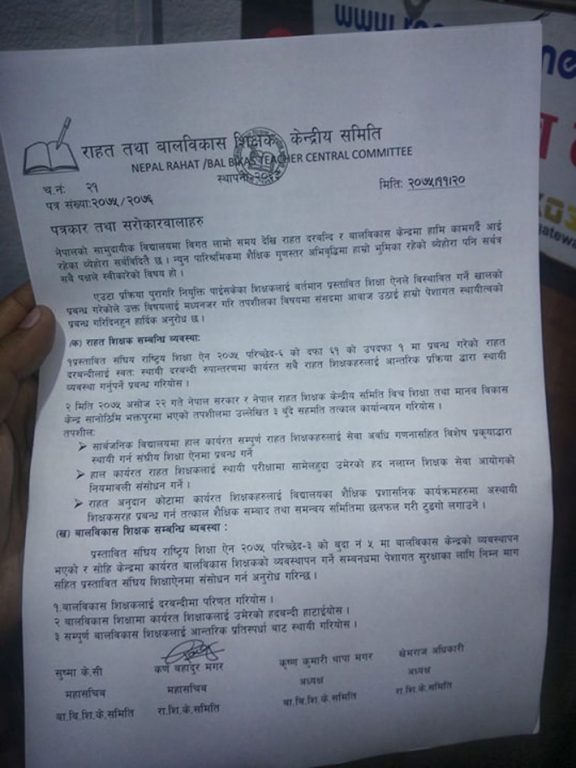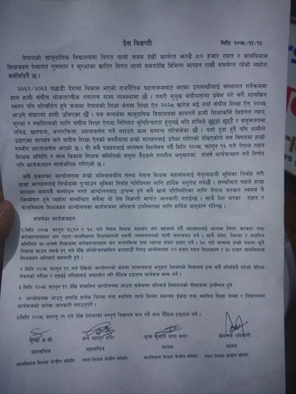 काठमाडौँ, २० फागुन: अस्थायी राहत शिक्षक संगठनले भोलिदेखि देशभरका सामुदायिक विद्यालय बन्दको आह्वान गरेको छ । सरकार आफ्ना मागप्रति गम्भीर नभएको भन्दै उनीहरुले बन्दको आह्वान गरेका हुन् । राहत शिक्षक तथा बालविकास शिक्षक र प्रहरीबीच सोमबार पनि नयाँ बानेश्वरमा झडप समेत भएको थियो ।