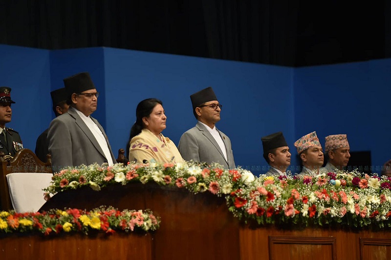 यिनै राष्ट्रिय कार्यभार पूरा गर्न मेरो सरकार काम गर्दैछ, नतिजा ल्याउँदैछ र अघि बढ्दैछ । यस अवधिमा महत्त्वपूर्ण उपलब्धिहरू हासिल भएका छन् । नेपाली जनताको त्याग, बलिदान र लामो सङ्घर्षबाट प्राप्त भएका राजनीतिक उपलब्धिहरूलाई सफलतापूर्वक संस्थागत गरिएको छ, थप सुदृढ र समुन्नत बनाइएको छ । सबै किसिमकासङ्क्रमण अन्त्य भई शान्ति र स्थायित्व कायम भएको छ । लोकतन्त्र हामी नेपालीको सात दशकभन्दा लामो सङ्घर्षको प्रतिफल हो । सङ्घीय लोकतान्त्रिक गणतन्त्र संविधानद्वारा सुनिश्चित गरिएको प्रणाली हो । जन्मसिद्ध श्रेष्ठतालाई अस्वीकार गर्दैपूर्ण लोकतन्त्रका आधारभूत सिद्धान्तलाई व्यवहारमा कार्यान्वयन गर्न हामी प्रतिबद्ध छौं ।