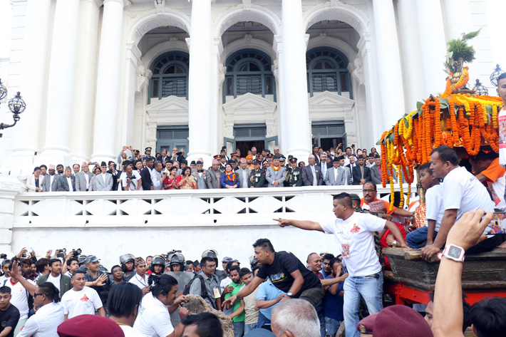 काठमाडौँ, २७ भदौ: राष्ट्रपति विद्यादेवी भण्डारीले हनुमाढोका दरबार क्षेत्रस्थित गद्दी बैठक सरीक भई अपराह्न ऐतिहासिक तथा सांस्कृतिक पर्व इन्द्रजात्रा जात्रा अवलोकन गर्नुभएको छ । राष्ट्रपति भण्डारीले श्रीगणेश, श्रीभैरव र श्रीकुमारीको रथमा दक्षिणा चढाई यात्रा गराउने अनुमति दिएपछि रथयात्रा गरिएको थियो । भाद्र शुक्ल द्वादशीका दिन हनुमानढोका दरबार क्षेत्रमा इन्द्रध्वजोत्थान गरी शुरु भएको इन्द्रजात्राको आज मुख्य दिन हो । आज तल्लोटोलमा रथयात्रा चलाइने गुठी संस्थान काठमाडौँ शाखाका प्रमुख शैलेन्द्र पौडेलले जानकारी दिनुभयो । शनिबार माथिल्लो टोलमा रथयात्रा गरिने छ ।