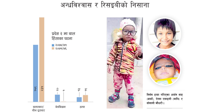जनकपुरधाम, भदौ २९: बालबालिका असुरक्षित छन्। दिनहुँजसो बलात्कार, अपहरण, हत्या, एसिड प्रहारजस्ता घटना भइरहेका छन्। यसबाट प्रदेश २ का बालबालिका झनै पीडित छन्। अन्नपूर्ण पाेस्ट दैनिकले खबर छापेकाे छ । आव ०७५/७६ मा प्रदेश २ मा चार सय ४७ वटा बाल हिंसाका घटना भएको प्रहरी तथ्यांक छ। ०७४/७५ मा बाल हिंसाका तीन सय ६४ वटा घटना प्रहरीमा दर्ता भएका थिए।