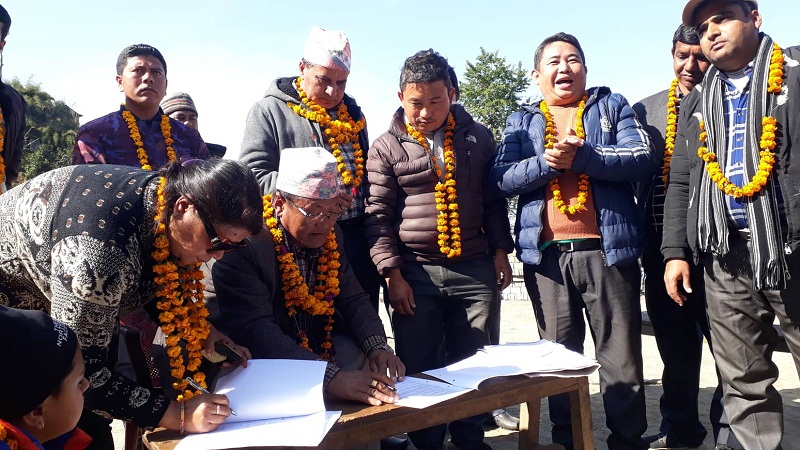 त्रिपक्षीय सम्झौतामा जिल्ला आयोजना कार्यान्वयन इकाई (भवन) का प्रमूख महालक्ष्मी जोशी, नगरप्रमूख टोक बहादुर वाइबा र उपभोक्ता समितिका अध्यक्ष आइतमान तामाङले हस्ताक्षर गरेका छन् ।