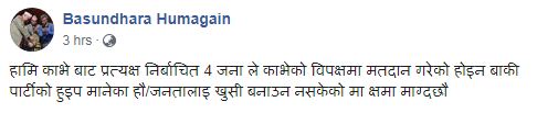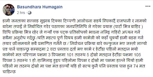 साथै उनले फेसबुकमै अर्को स्टाटस लेख्दै भनेका छन् , निर्वाचन प्रक्रियाका बारेमा कन्फ्यूज भए जस्तो लाग्यो । प्रष्ट पार्न चाहान्छु । संसदमा २ वटा प्रस्ताव दर्ता भयो । एउटा काभ्रे र अर्को हेटौंडा । पहिलोमा मतदान भयो । काभ्रेको मत परिणाम पक्षमा ३ र विपक्षमा १०१, तटस्थ ५ मत रह्यो । दोस्रो मतदान हैटाँडाको पक्षमा १०५, विपक्षमा ३ र तटस्थ १ हो ।’