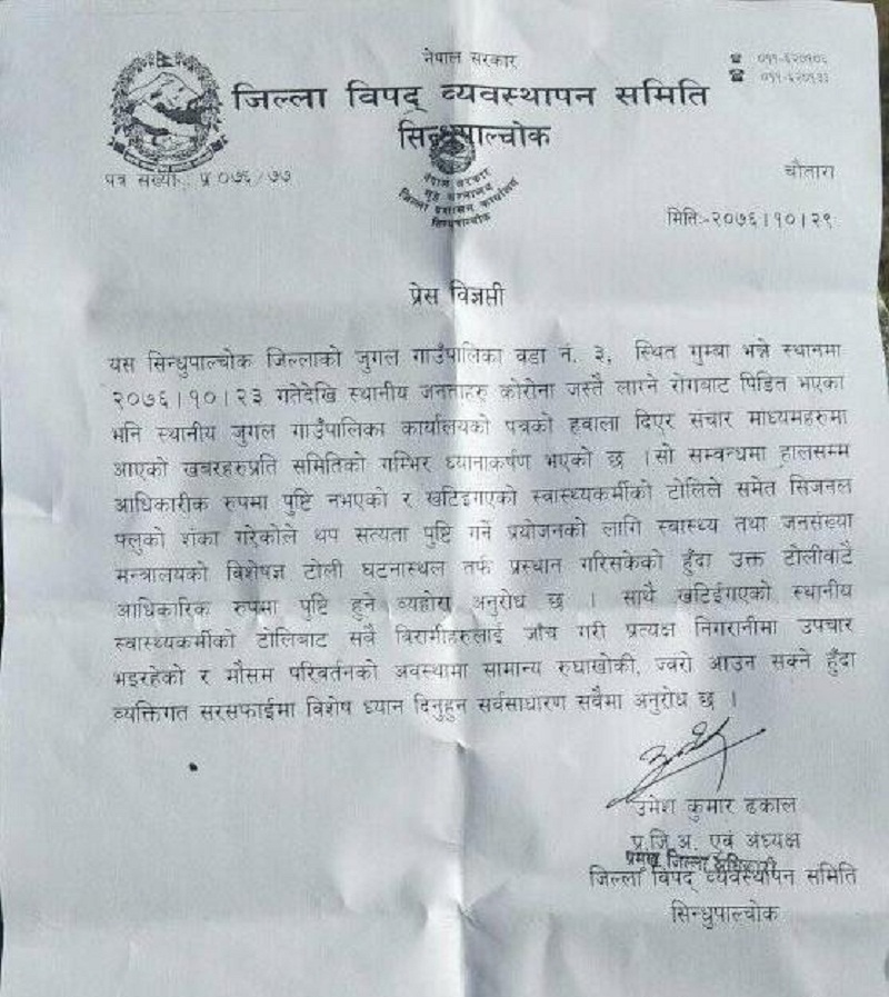 धुलिखेल, २९ माघः जिल्ला विपद् ब्यवस्थापन समिति सिन्धुपाल्चोकले जुगल गाउँपालिकाको वडा नम्बर ३ गुम्बामा देखिएको लक्षण कोरोनाभाइरस नभएको भन्दै नआत्ति आग्रह गरेको छ । प्रमुख जिल्ला अधिकारी एवं जिल्ला विपद् ब्यवस्थापन समितिका अध्यक्ष उमेश कुमार ढकालले बुधबार (आज) एक प्रेस विज्ञाप्ति निकालेर यस्तो बताएका हुन् । विज्ञप्तिमा गाउँपालिकाको पत्रको हवाला दिएर सञ्चार माध्यमहरुमा आएको खबरप्रति ध्यानाकर्षण भएको समेत उल्लेख गरिएको छ ।