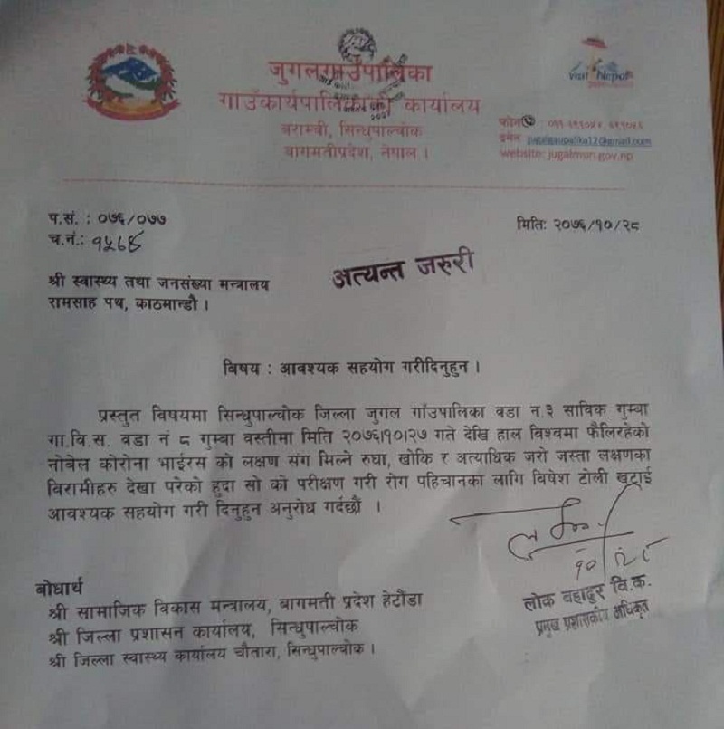गाउँपालिकाले मंगलबार संघीय सरकारको स्वास्थ्य तथा जनसंख्या मन्त्रलायलाई पत्र लेख्दै नोबेल कोरोना भाइरससँग मिल्दोजुल्दो लक्षण देखा परेको भन्दै विज्ञ टोली पठाउन माग गरेको थियो । गुम्बाका स्थानीयमा रुघाखोकी र अत्याधिक ज्वरो देखिएको उपचारमा संलग्न स्वास्थ्य कर्मीको टोली बताएका छन् ।