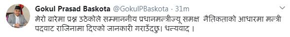 ‘मेरोबारेमा प्रश्न उठेकोले सम्माननीय प्रधानमन्त्रीज्यूसमक्ष नैतिकताको आधारमा मन्त्री पदबाट राजीनामा दिएको जानकारी गराउँदछु । धन्यवाद ।’–उनले ट्वीटमा लेखेका छन् ।