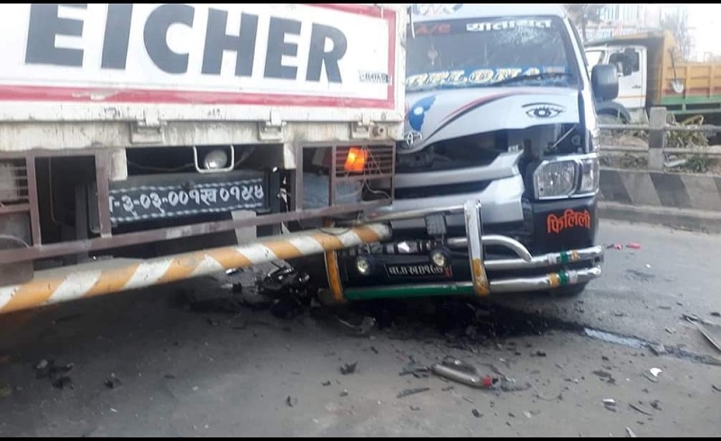 बिहिबार विहानै धुलिखेलमा माइक्रोबस र मालवाहक ट्रक एकआपसमा ठोक्किएर दुर्घटनामा भएकाे छ । झापाबाट काठमाडौंतर्फ आउँदै गरेको बा ४ ख ४१ ८७ नम्बरको यात्रुवाहक माइक्रोबस र काठमाडौबाट धुलिखेलतर्फ आउदै गरेको प्रदेश नं ३-३-००-१९४ नम्बरको मालवाहक ट्रक धुलिखलेकाे पुरानाे बसपार्कमा एकआपसमा ठोक्किएर दुर्घटनामा भएकाे हाे ।