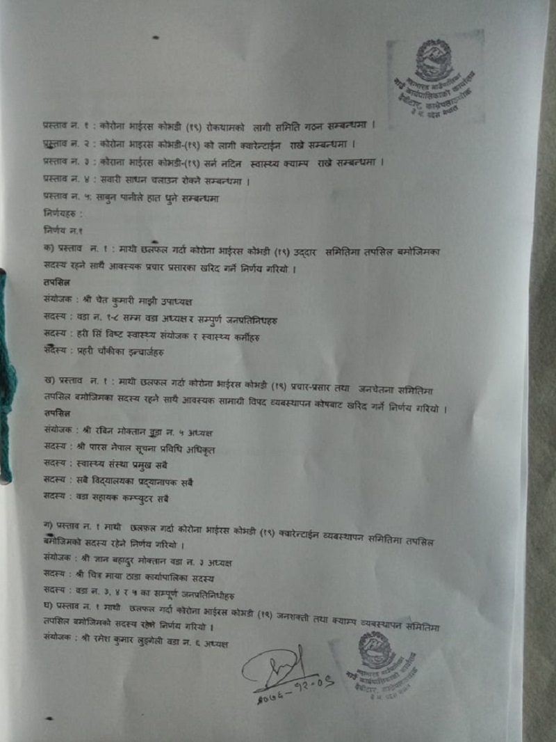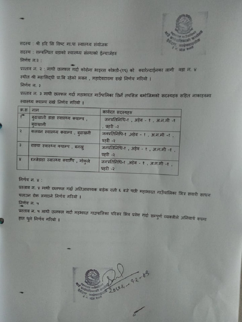 कार्यपालिका बैठकले उपाध्यक्ष चेतकुमारी माझीको संयोजकत्वमा उद्धार समिति बनाएको छ । वडा नम्बर ४ मा रहेको महासिद्धी प्राथमिक विद्यालयको भवनलाई क्वारेन्टाईनको रुपमा प्रयोग गर्ने पनि निर्माण गरेको छ । त्यसैगरी अत्यावश्क बाहेक राती ६ बजेपछि महाभारत गाउँपािलकाभित्र सवारी साधन चलाउन रोक लगाउने निर्माण पनि गरेको छ ।