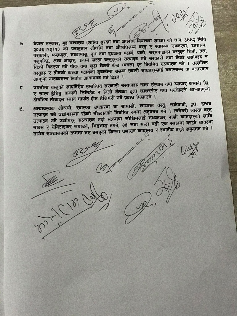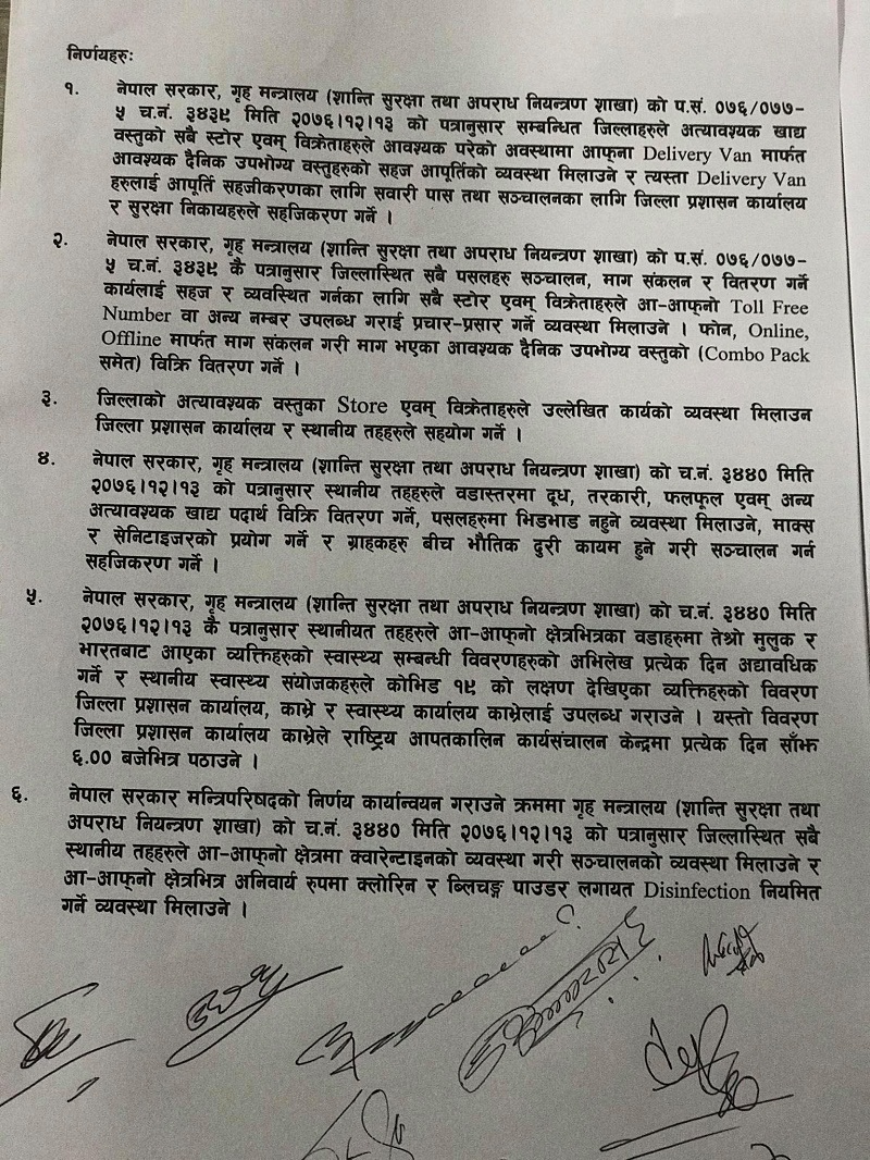 बैठकले जिल्लामा औषधि तथा औषधिजन्य वस्तु र स्वास्थ्य उपकरण, खाद्यान्न, तरकारी, फलफूल, माछामासु, दुध तथा दुधजन्य पदार्थ, पानी, सरसफाईका वस्तु, चिनी, तेल, पशुपन्छि, अन्य आहार, इन्धन जसता वस्तुहरुको उत्पादन गर्ने सरकारी तथा निजी उद्योगहरु र बिक्री वितरण गर्ने थोक तथा खुद्रा बिक्री केन्द्र (पसल) हरु नियमित सञ्चागन गर्ने । यी वस्तु र तीनको कच्चा पदार्थको ढुवानीमा संलग्न सवारी साधनलाई बजारसम्म र बजारबाट आफ्नो गन्तब्यसम्म निर्वाध आवागमन गर्न दिइने उल्लेख छ ।