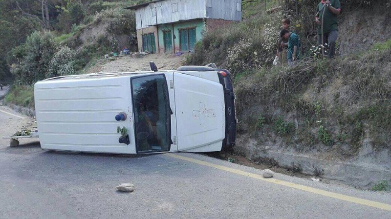 धुलिखेल, २१ चैतः बीपी राजमार्गकाे धुलिखेल नगरपालिकाको वडा नम्बर ११ डाँडागाउँमा एम्बुलेन्स दुर्घटना भएको छ । सिन्धुलीबाट गर्भवती महिला लिएर आएको ज १ च १४३९ नम्बरको एम्बुलेन्स अनियन्त्रित भएर सडकमै पल्टिएको जिल्ला प्रहरी कार्यालय काभ्रेले जनाएको छ ।