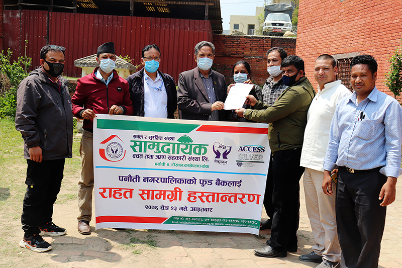 विश्वभर तिब्र गतिमा फैलिरहेको कोरोना भाईरस (कोभिड १९) का कारण नेपाल सरकार लगायत स्थानीय तहहरुले गरेको लक डाउनका कारण दैनिक ज्याला मजदुरी गरी छाक टार्नुपर्ने वर्गलाई लक्षित गरी राहत वितरण गर्ने उदेश्यले विभिन्न स्थानीय तहहरुले आ-आफ्नै स्थानबाट विभिन्न उपायहरु अपनाउदै राहत वितरण गरिरहेको अवस्थामा पनौती नगरपालिकाले खाद्यान्न सामाग्रीहरु राहत स्वरुप वितरण गर्न पालिकाले खाद्यान्न संकलन केन्द्र (फुड बैंक) को स्थापना गरी विभिन्न संघ संस्थाहरुलाई सहयोगको अपिल गरेकोमा सामुदायिक बचत तथा ऋण सहकारी संस्था लि. पनौतीले नगरपालिकाको उक्त फुड बैंकलाई खाने शुद्ध तोरीको तेल २९४ लिटर सहयोग गरिएको संस्थाका प्रमुख कार्यकारी अधिकृत मदन बस्नेतले बताए ।