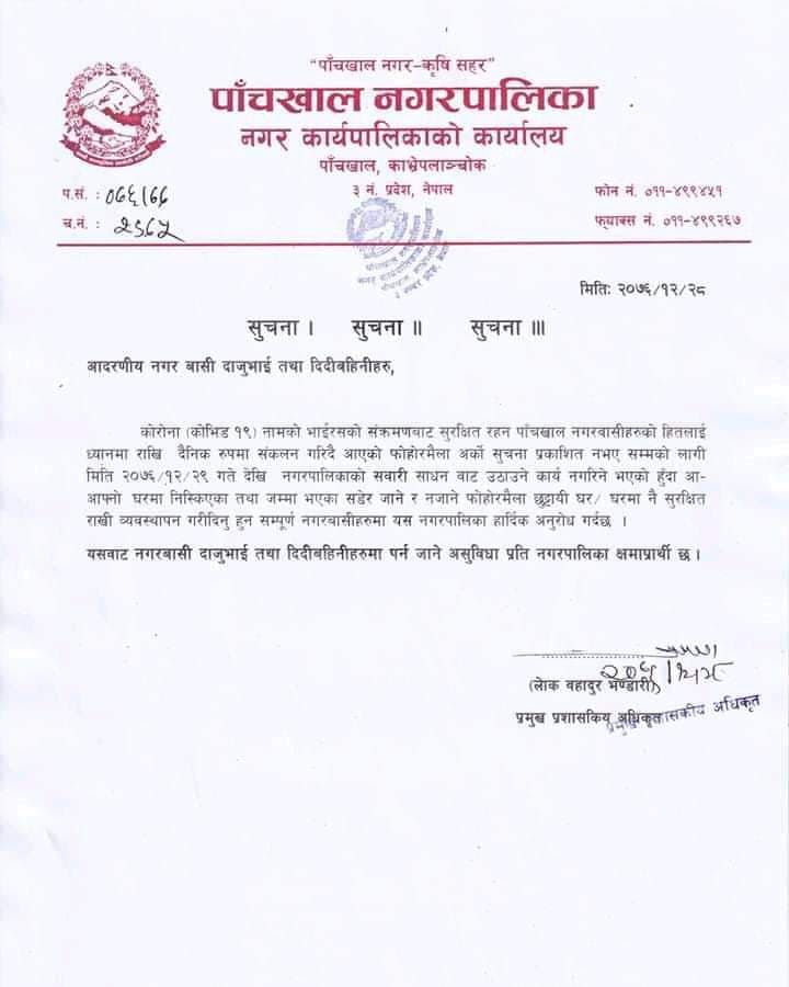 धुलिखेल, २९ चैतः काभ्रेको पाँचखाल नगरपालिकाले आजदेखि फोहोरमैला संलकनका लागि सवारी साधन प्रयोग गर्ने बताएको छ । नगरपालिकाका प्रमुख प्रशासकीय अधिकृत लोक बहादुर भण्डारीले एक सुचना निकालेर कोरोना भाइसरको संक्रमणबाट सुरक्षित रहन यस्तो निर्णय गरिएको बताए ।