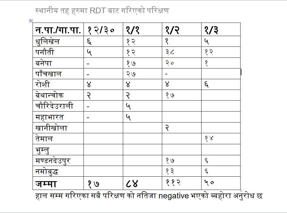 जिल्लाको सबैभन्दा बढी पनौती नगरपालिकामा ६७ जनामा आरडिटी परिक्षण गरिएको छ । फागुन ३० गतेदेखि यता विदेशबा जिल्ला भित्रिएका नारिकमा आरडिटी मार्फत परिक्षण गरिएको डाक्टर झाले बताए । सबैभन्दा कम जिल्लाको अतिविकट डाँडापारी क्षेत्रमा पर्ने खानीखोला गाउँपालिकामा २ जनाको आरडिटी परिक्षण गरिएको छ ।