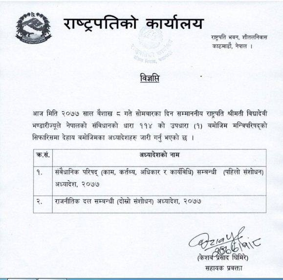 काठमाडौं ८ वैशाख : राष्ट्रपति विद्यादेवी भण्डारीले मन्त्रिपरिषदले सिफारिस गरेको अध्यादेश जारी गरेकी छन् । राष्ट्रपति भण्डारीले राजनीतिक दल सम्बन्धी दोस्रो संशोधन अध्यादेश २०७७ र संवैधानिक परिषद कार्यविधि संशोधन अध्यादेश,२०७७ जारी गरिएको जनाएको छ । मन्त्रिपरिषद बैठकले सोमबार दुबै अध्यादेश राष्ट्रपतिसमक्ष सिफारिर गरेको थियो ।