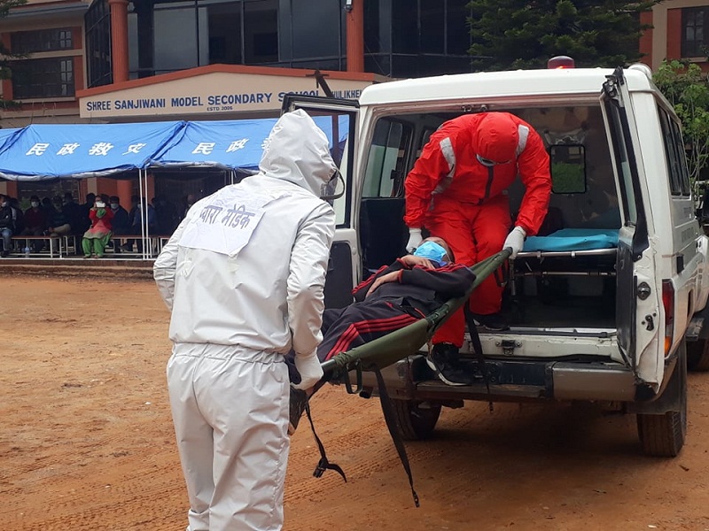 कोरोना संक्रमित बिरामीलाई एम्बुलेन्सले घरसम्म लिन जाने, अस्पतालमा बिरामी आउँदा र आइसोलेसनमा राखरे उपचार गर्दा डाक्टरहरुले अपनाउने विधिबारे प्रर्दशनी गरिएको जिल्ला स्वास्थ्य कार्यालय काभ्रेका प्रमुख डाक्टर नरेन्द्रकुमार झाले बताउनु भयो ।