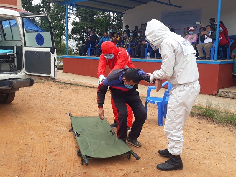 त्यस्तै नेपाली सेनाले कोरोना भाइरसका कारण उपचारको क्रममा बिरामीको मृत्यु भएमा शव बोक्ने देखि दाहसंस्कारका बेला अपनाउनुपर्ने विधि प्रदर्शन गरेको थियो ।