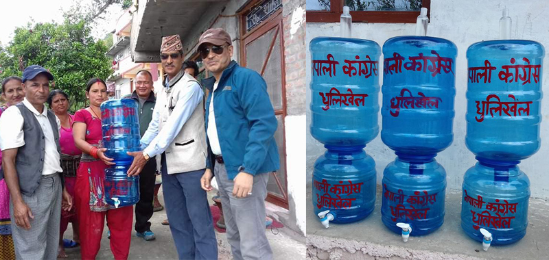 यसको अर्थ सहयोग दिनै हुदैँन थियो भन्ने होइन । विपद्का बेला हरेक टोल, गाउँ, बस्ती पुगेर सहयोग गर्नु सबैको दायित्व हो । तर गएको स्थानीय तहको निर्वाचनमा नेपाली काँग्रेसका तर्फबाट धुलिखेल नगरपालिका मेयरका प्रत्याशि एवं काँग्रेसका प्रभावशाली नेताका रुपमा चिनिने रमेशप्रसाद हुमागाई आफै धुलिखेल नगरपालिका वडा नम्बर ३ का विभिन्न गाउँ पुगेर ‘नेपाली काँग्रेस धुलिखेल’ लेखिएको पानीको जार वितरण गरेका छन् ।