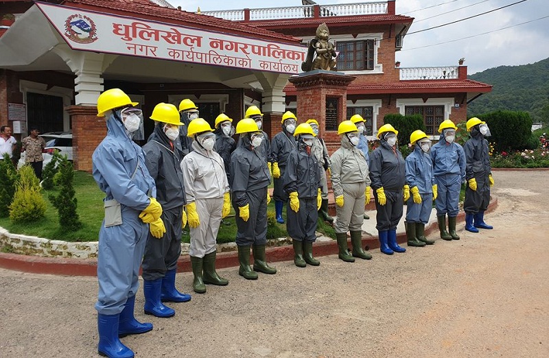 धुलिखेल, २९ जेठः काभ्रेको धुलिखेल नगरपालिकाले नगर क्षेत्र भित्र फोहोरमैला व्यवस्थापन गर्न खटिएका सबै कर्मचारीलाई पि.पि.ई सेट वितरण गरेको छ । कोरोना भाइरसको महामारीका बिच फोहोरमैला व्यवस्थापनमा खटिएका कर्मचारीको सुरक्षाका लागि पि.पि.ई सेट बितरण गरिएको नगर प्रमुख अशोक कुमार ब्याञ्जुले जानकारी दिए ।