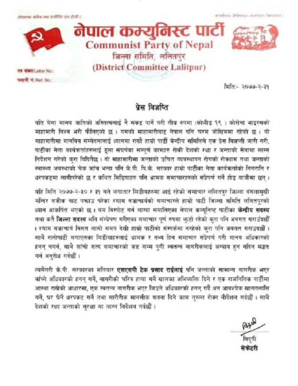 घटनापछि सेक्रेटरी विदुषीको नामबाट जारी विज्ञप्तिमा भनिएको छ, ‘केपी सरकारका मतियार एसएसपी टेकप्रसाद राईलाई पनि जनताको सामान्य नागरिक भएर बाँच्ने अधिकारको हनन् गर्ने, नागरिकको चरित्र हइता गर्ने खालका अभिव्यक्ति दिने र एक राजनीतिक पार्टीमा आस्था राखेको आधारमा, एक स्वतन्त्र नागरिक भएर जिउने अधिकारको हनन् गर्दै अनावश्यक खानतलासी गर्ने, घर घर्ने घरपकड गर्ने तथा शारीरिक, मानसिक यातना दिने काम तुरुन्त रोक्न निर्देशन गर्दछौं ।’