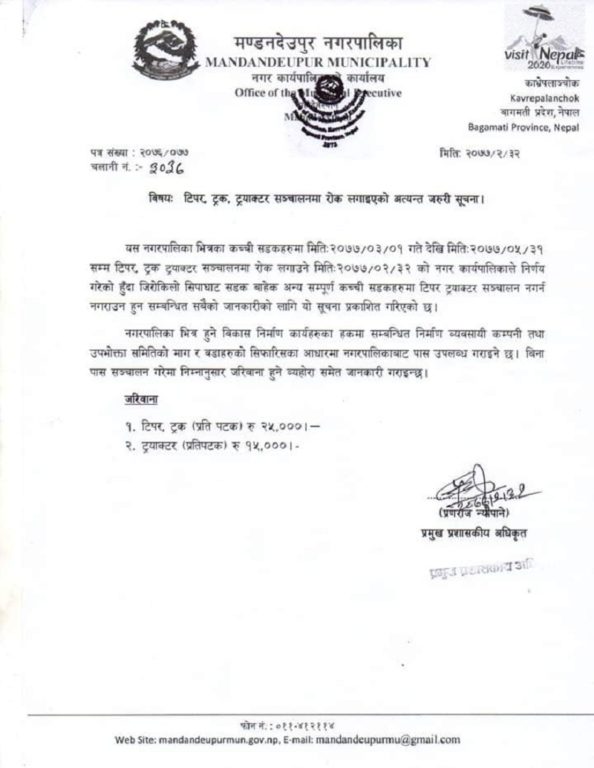 धुलिखेल, १ असारः काभ्रेको मण्डनदेउपुर नगरपालिकाले टिपर, ट्रक, ट्याक्टर सञ्चालनमा रोक लगाएको छ । नगरपालिकाले आज (सोमबार) देखि टिपर, ट्रक, ट्याक्टर सञ्चालनमा रोक लगाएको हो । आइतबार बसेको कार्यपालिका बैठकले नगपालिकाको विकास योजनामा प्रयोग हुने बाहेक अन्य कुनै पनि कामका लागि टिपर, ट्रक, ट्याक्टर चलाउन नपाउने निर्णय गरेको हो ।