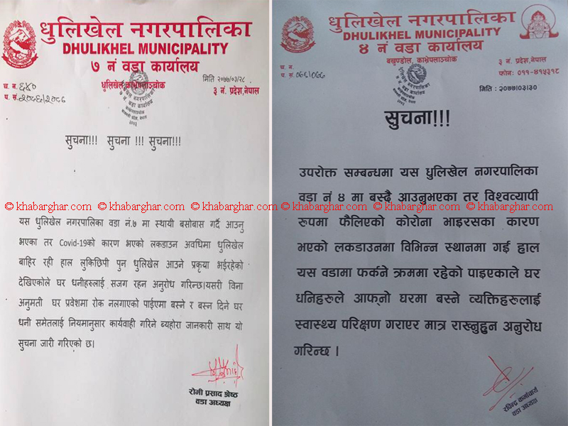 धुलिखेल, ३० असारः धुलिखेल नगरपालिकाका केहि वडाहरुले कोठामा फर्किएकाहरुलाई अनिवार्य स्वास्थ्य परीक्षण गराएर मात्रै राख्न आग्रह गरेका छन् । उनीहरुले कोरोना संक्रमण नफैलियोस् भन्नका लागि गरिएको लकडाउनसँगै कोठा छोडेर आफ्नो पुख्यौली घर गएकाहरु फेरी फर्कने क्रम चल्नेको भन्दै घरधनीलाई सचेत गराएका हुन् ।
