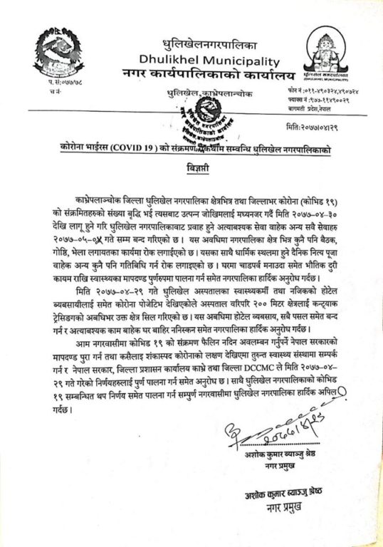 नगरपालिकाले धुलिखेल अस्पतालका स्वास्थ्यकर्मी र अस्पताल नजिकै रहेको होटल सञ्चालकमा कोरोना संक्रमण देखिएपछि सेवा बन्द गर्ने निर्णय गरेको हो । दुई जनामा संक्रमण देखिएपछि अस्पताल वरिपरि २ सय मिटर क्षेत्रलाई कन्ट्याक ट्रेसिङको अवधिभर शिल गरिएको छ । यो अविधमा त्यस क्षेत्रमा होटल ब्यवसाय, पसल बन्द गर्न र अत्यावश्यक काम बाहेक घर बाहिर ननिस्कन नगरपालिकाले आग्रह गरेको छ ।