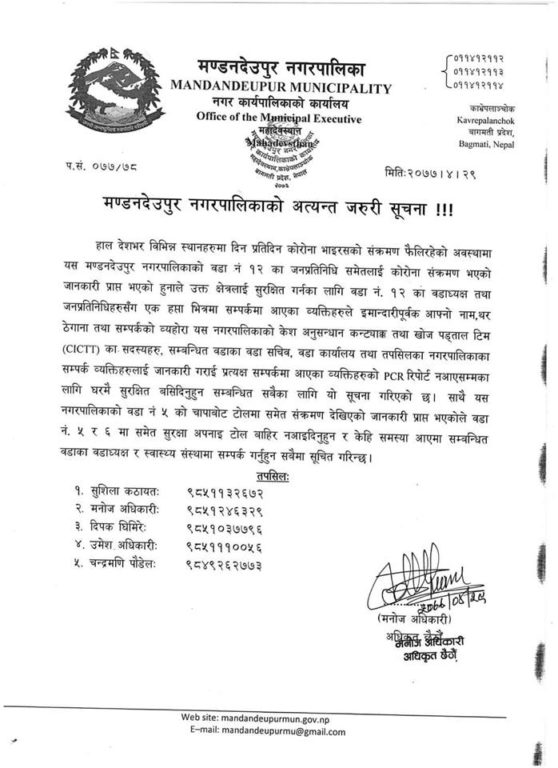 धुलिखेल, २९ साउनः काभ्रेको मण्डनदेउपुर नगरपालिकाले संक्रमितको सम्पर्कमा रहेको सबैलाई पीसीआर गराउन सम्पर्कमा आउने आग्रह गरेको छ । नगरपालिकाले कोरोना संक्रमित वडा नम्बर १२ का वडाध्यक्षको सम्पर्कमा एकहप्ताभित्र पुगेको सबै ब्यक्तिहरुलाई इमान्दारीपूर्वक आफ्नो नाम, थर, ठेगाना र सम्पर्कको ब्यहोरा सहित सीआईसीटीटीको सम्पर्कमा आउने भनेको छ ।
