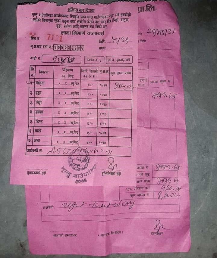 नाम उल्लेख नगर्ने ती स्थानीयका अनुसार भदौ २८ र ३१ गते छड्के जाँच गर्दा पनि लामा सप्लार्यसकै नाममा रसिद काटिएको थियो । दोलालघाटको प्रहरीलाई समेत स्थानीयले अवैध रुपमा निर्माण सामग्री निकासी भइरहेको जानकारी गराएका थिए । तर प्रहरीले समेत कुनै चासो नदिएको ती स्थानीयको भनाई छ । समानन्तरले साउन १ देखि यताको गाउँपालिकामा कुनै पनि कर नबुझाएको स्थानीयहरुले दाबी गरेका छन् । तर समानन्तरका सञ्चालक मध्येका एक तीर्थ लामाले भने नियमित बील काट्ने मान्छे घर गएका बेला गल्तीले ४ वटा गाडीको मात्रै अर्कोका रसिद काट्न पुगेको बताउनुभयो ।