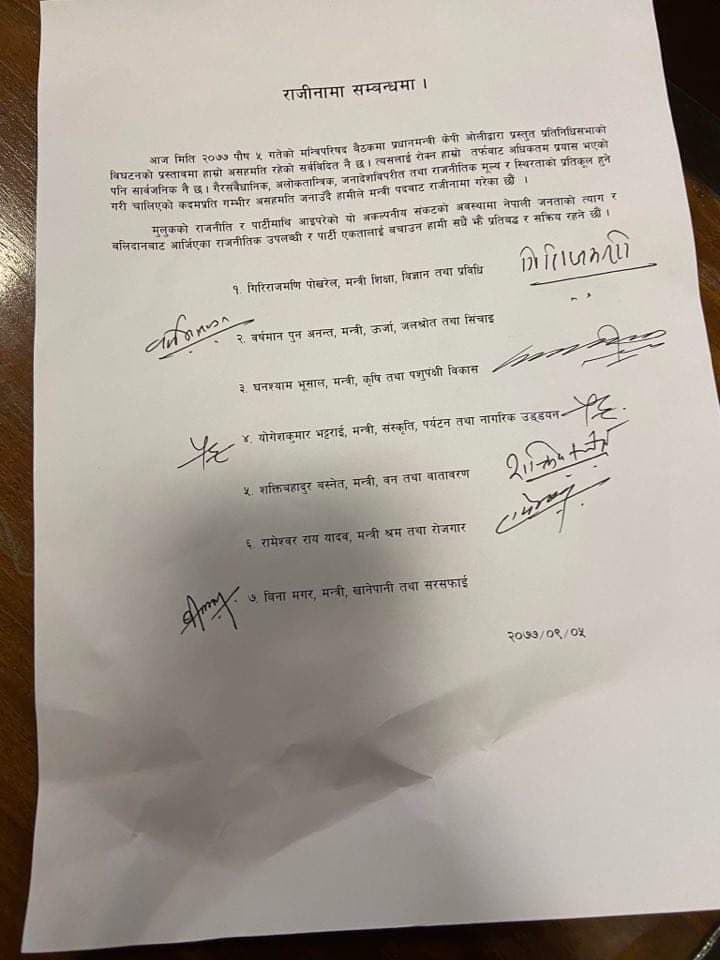 राजीनामा दिनेहरुमा कृषिमन्त्री घनश्याम भुसाल, पर्यटनमन्त्री योगेश भट्टराई, उर्जामन्त्री वर्षमान पुन, वनमन्त्री शक्ति बस्नेत, शिक्षामन्त्री गिरिराजमणि पोखरेल, खानेपानीमन्त्री विना मगर र श्रममन्त्री रामेश्वर राय यादव छन् ।
