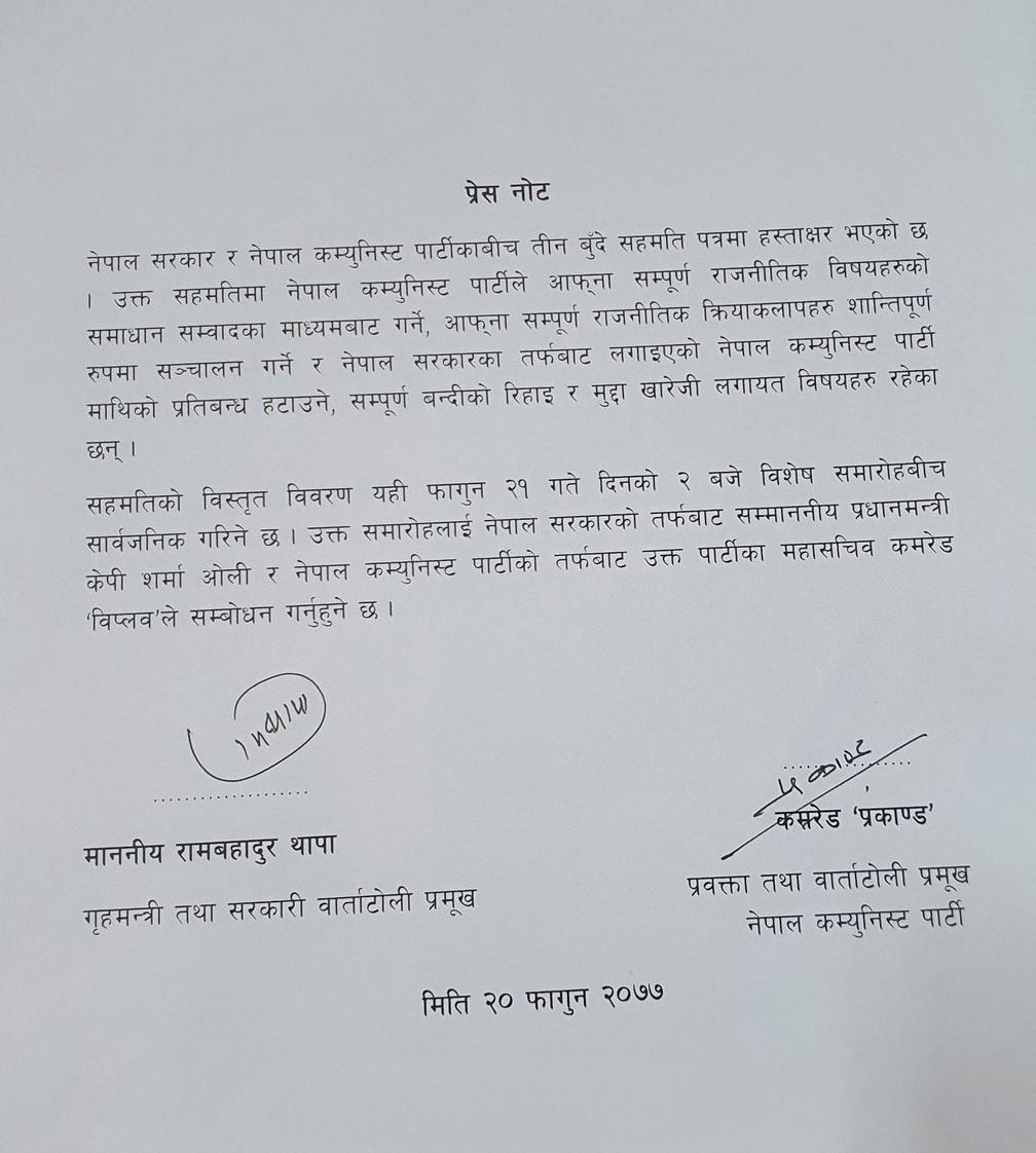 सहमतिको विस्तृत विवरण भने फागुन २१ गते विशेष समारोहबीच सार्वजनिक गरिने भएको छ । उक्त समारोहलाई नेपाल सरकारको तर्फबाट प्रधानमन्त्री केपी ओली र नेकपा विप्लवको तर्फबाट उक्त पार्टीका महासचिव कमरेड ‘विप्लव’ले सम्बोधन गर्ने सहमति पत्रमा उल्लेख छ ।