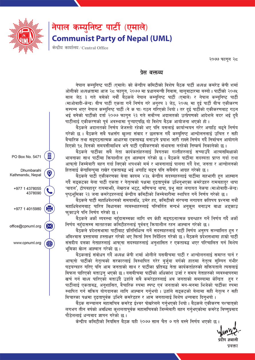 पार्टीका सबै नेता कार्यकर्तालाई विगतका गल्तीलाई सच्याउँदै आत्मसमिक्षाको भावनाका साथ पार्टीमा क्रियाशील हुन आह्वान गरेको वैठकपछि पार्टी प्रवक्ता प्रदीप ज्ञवालीद्वारा जारी विज्ञप्तिमा उल्लेख छ ।