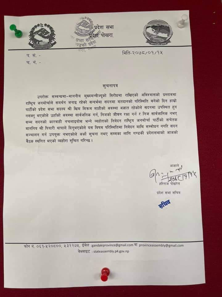 पोखरा १५ बैशाख । गण्डकी प्रदेशसभाको वैठक अनिश्चितकालका लागि स्थगित भएको छ । अविश्वास प्रस्ताव पारित नहुने भएपछि जनमोर्चाका सांसद खिमविक्रम शाहीको खोजी गर्न माग गर्दै पियारी थापाले दिएकाे निवेदनकाे आधारमा सभामुख नेत्रराज अधिकारीले अनिश्चितकालका लागि बैठक स्थगित गरेको सूचना टाँस गरी वैठक अनिश्चितकालका लागि स्थगित गरेको हो ।