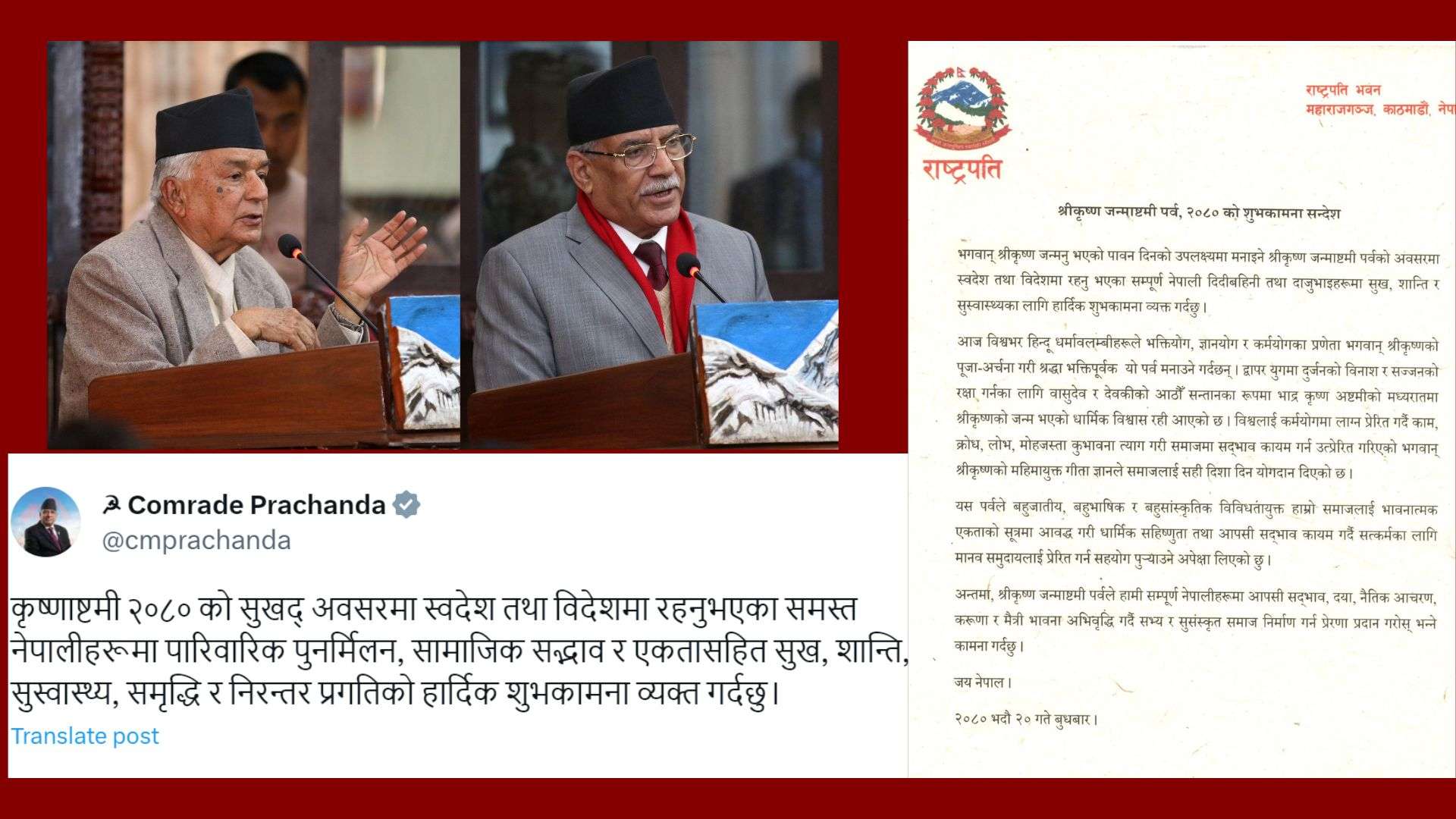उनले टुइटरमा लेखेका छन्, ‘‘कृष्णाष्टमी २०८० को सुखद् अवसरमा स्वदेश तथा विदेशमा रहनुभएका समस्त नेपालीहरूमा पारिवारिक पुनर्मिलन, सामाजिक सद्भाव र एकतासहित सुख, शान्ति, सुस्वास्थ्य, समृद्धि र निरन्तर प्रगतिको हार्दिक शुभकामना व्यक्त गर्दछु।’’