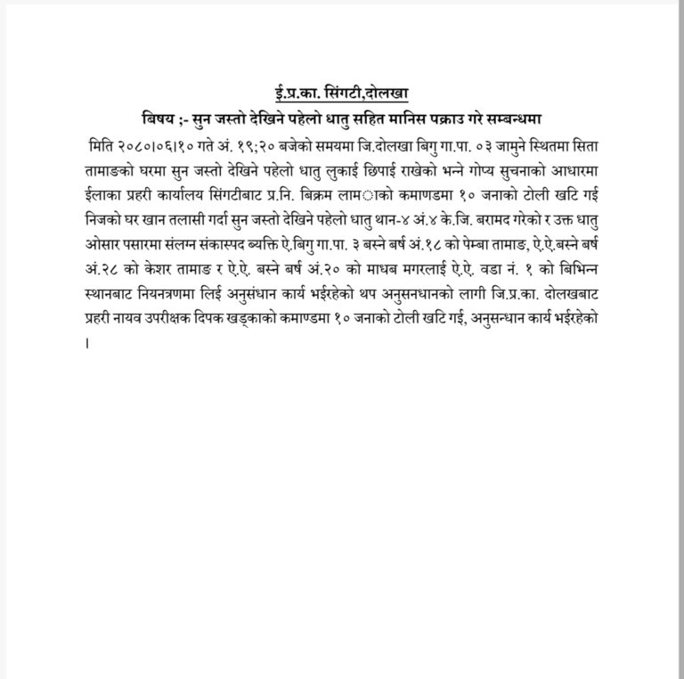 सुन जस्तो देखिने धातु बरामद गरेर परीक्षणका लागि पठाएको र इलाका प्रहरी कार्यालय सिंगटी र जिल्ला प्रहरी कार्यालय दोलखाको टोलीले सुन कारोबारमा संलग्न ३ जनालाई प्रहरीले नियन्त्रणमा लिएको छ । पक्राउ पर्नेमा विगु गाउँपालिका–३, का १८ वर्षिय पेम्बा तामाङ, सोही स्थानका केशर तामाङ र २० वर्षिय माधव मगर रहेका छन् ।