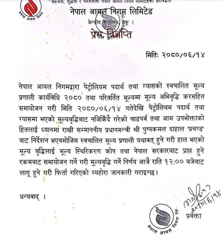 निगमले हिजो पेट्रोल लिटरमा २ रुपैयाँ र डिजेल तथा मट्टीतेल लिटरमा ६ रुपैयाँले बढाएको थियो । त्यस्तै खाना पकाउने ग्यासको मूल्य प्रतिसिलिन्डर २ सय १५ रुपैयाँले बढाएको थियो । निगमले हवाई इन्धन आन्तरिक र अन्तर्राष्ट्रिय दुवैमा प्रतिलिटर ८ रुपैयाँले बढाएको थियो ।