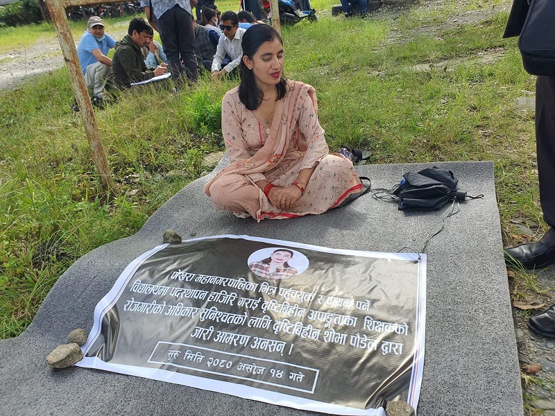 पोखरा-१ बगरमा रहेको शिक्षा विकास निर्देशनालय गण्डकी र शिक्षा विकास समन्वय इकाई कास्कीको परिसरमा दृष्टिविहीन शोभा पौडेल हिजो आइतवारदेखि अनसन बस्नु भएको हो ।