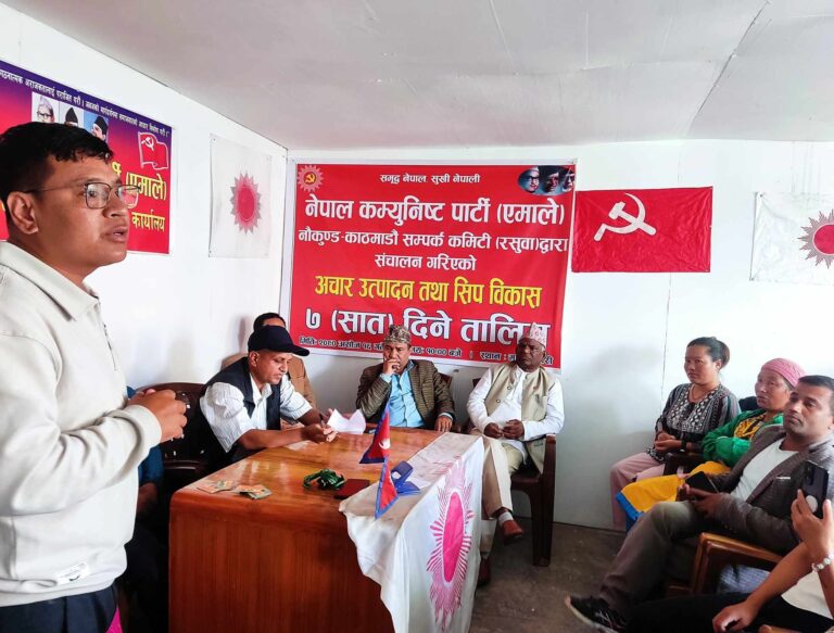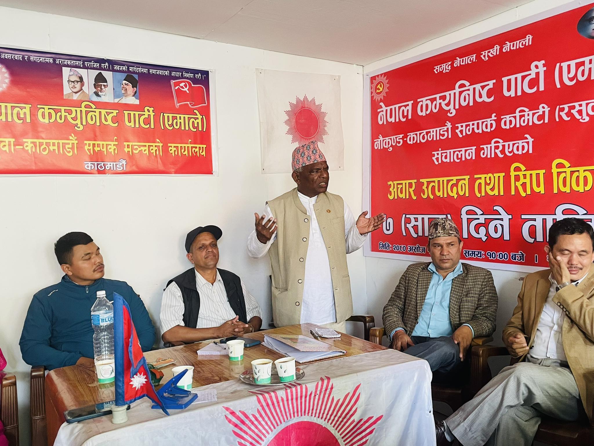 नेकपा एमालेले समाजवाद उन्मुख अर्थतन्त्र निर्माणमा यूवालाई सहभागी गराउनुपर्नेमा जोडदिदै नेकपा एमालेका पुर्वमन्त्री एवं स्थायी कमिटी सदस्य लालबाबु पण्डितले अचार उत्पादन तालिमको उदघाट्न गरेका थिए । ‘सीप सिकौं, स्वदेशमै आत्मनिर्भर बनौं ‘ भन्ने नाराका साथ सुरुभएको तालिममा नौकुण्ड गाउँपालिकाबाट काठमाण्डौ बसोबास गर्ने २०जना सहभागी रहेको नौकुण्ड काठमाडौं सम्पर्क कमिटीका अध्यक्ष शरण ग्याम्देनले बताए । नौकुण्ड गाउँपालिकाबाट बैदेशिक रोजगारका लागि विदेश जाने यूवा समूहलाई रोक्न र देशमै रोजगार सिर्जना गर्न एमालेले महत्वपूर्ण भुमिका निर्वाह गर्दै यस्ता सिपमुलक तालिमहरु गर्दै जाने नेकपा एमाले रसुवा जिल्ला कमिटी सदस्य डिल्लीराज तामाङले बताएका छन् ।