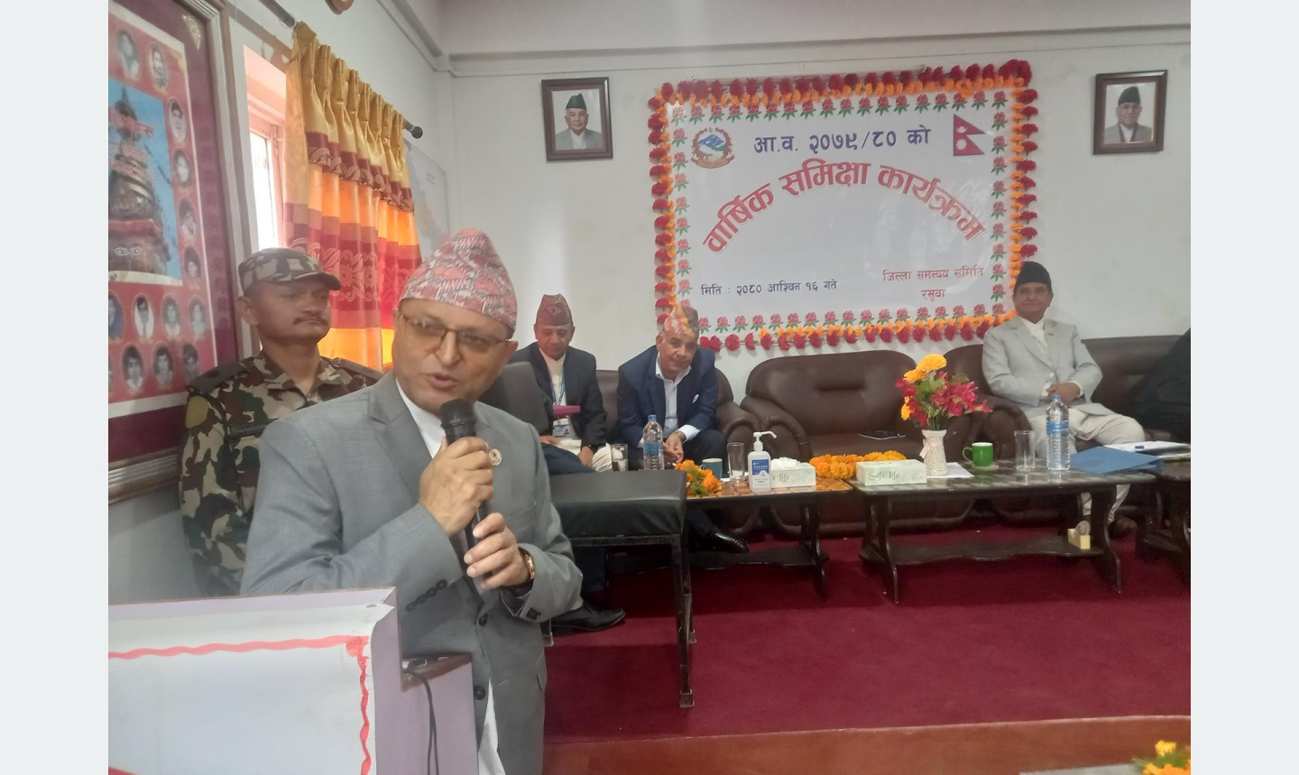 जिल्ला समन्वय समिति रसुवाद्वारा आयोजित जिल्लास्तरीय वार्षिक समीक्षा कार्यक्रमको मङ्गलबार धुञ्चेमा उद्घाटन गर्दै अध्यक्ष तिमल्सिनाले पवित्र तीर्थ गोसाइँकुण्डको स्नान तथा प्रकृतिक रूपको अनुपम छटा अवलोकनका लागि उच्च भागमा पुग्ने धार्मिक यात्रुलाई सुविधायुक्त पूर्वाधार निर्माण गराउन अत्यावश्यक भएको बताए ।