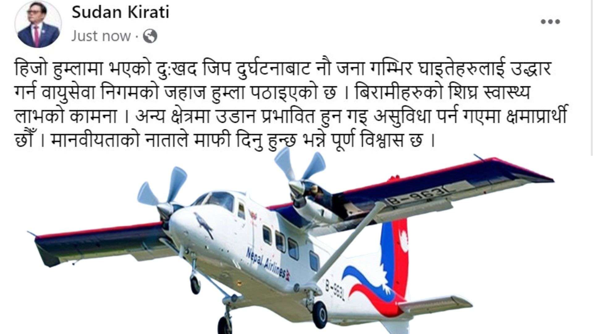 उनले लेखेका छन्,‘ हिजो हुम्लामा भएको दुःखद जिप दुर्घटनाबाट नौ जना गम्भिर घाइतेहरुलाई उद्धार गर्न वायुसेवा निगमको जहाज हुम्ला पठाइएको छ । बिरामीहरुको शिघ्र स्वास्थ्य लाभको कामना । अन्य क्षेत्रमा उडान प्रभावित हुन गइ असुविधा पर्न गएमा क्षमाप्रार्थी छौँ । मानवीयताको नाताले माफी दिनु हुन्छ भन्ने पूर्ण विश्वास छ ।’