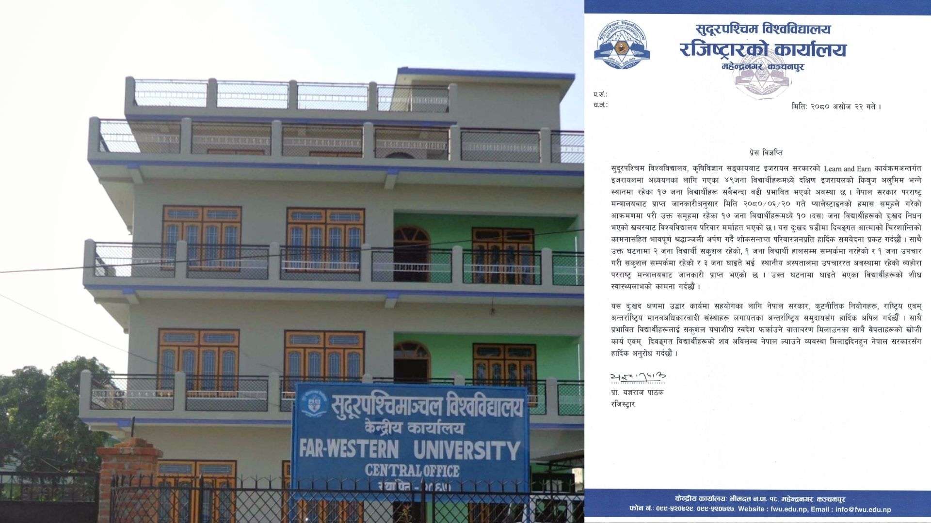 इजरायल आक्रमणमा सुदूरपश्चिम विश्वविद्यालयबाटा इजरायल गएका १० जना विद्यार्थीको निधन भएको छ । एग्रिकल्चर अध्ययन गर्ने विद्यार्थीहरू दक्षिण इजरायलको किवुज अलमुम भन्ने ठाउँमा कार्यरत थिए ।