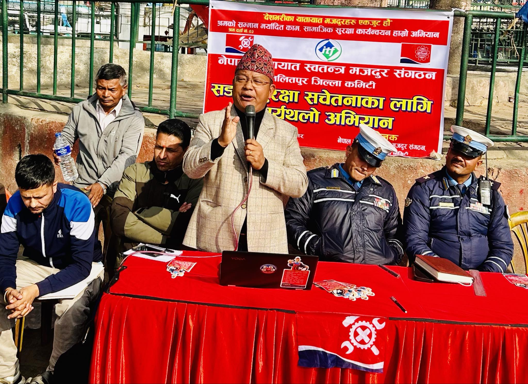 कार्यक्रममा संगठनका केन्द्रीय उपाध्यक्ष नवराज घिमिरेले मजदुरहरुको हक, हित र अधिकारको मुद्धा यस संगठनले ४५ वर्षदेखि गर्दै आइरहेको भएपनि यतिबेला सडक दुर्घटना सबैले चासो राख्नु पर्ने भएकाले संगठनले यो अभियान चलाएको बताउनुभयो । संगठनका उपाध्यक्ष विष्णु लामा महासचिव केशव थापा, बागमती प्रदेश अध्यक्ष शंकर थापा, सचिव शिवकुमार श्रेष्ठ, सहसचिव गणेश श्रेष्ठ लगायतको उपस्थिति थियो । सुग्रिब थिङले सञ्चालन गरेको कार्यक्रमको अध्यक्षता विनोद बुढाथोकीले गर्नुभएको थियो ।